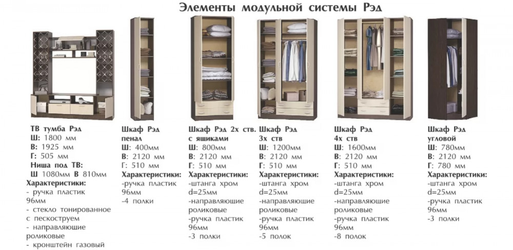 Классическая модульная система «Рэд», несомненно дополнит собой любой интерьер квартиры или дома. В гостиной есть все необходимые элементы для  оформления комнаты. Стеклянные витрины создают современный и стильный образ вашему дому.