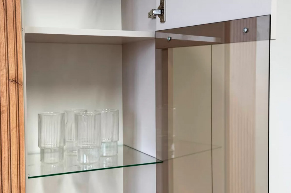 Вторая дверь, выполненная со стеклянной вставкой, позволяет демонстрировать коллекции, декоративные предметы или книги, придавая вашему пространству дополнительный шарм и элегантность.