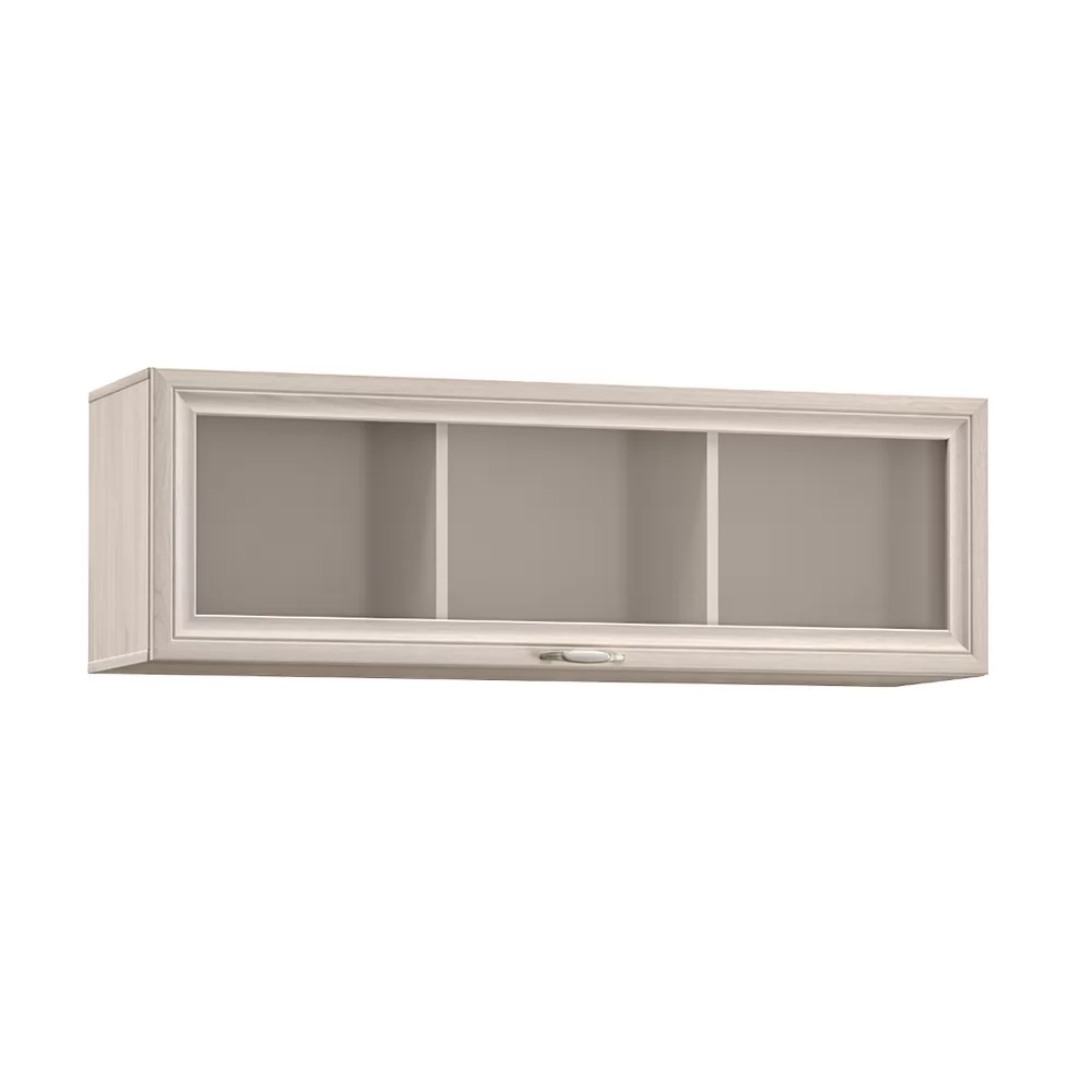 Навесной шкаф "Бьянка" №10.69 включает в себя три секции за стеклянной дверцей.