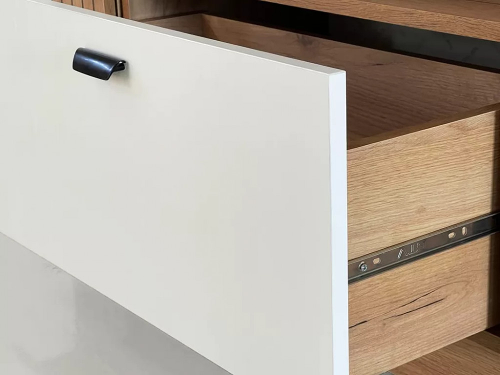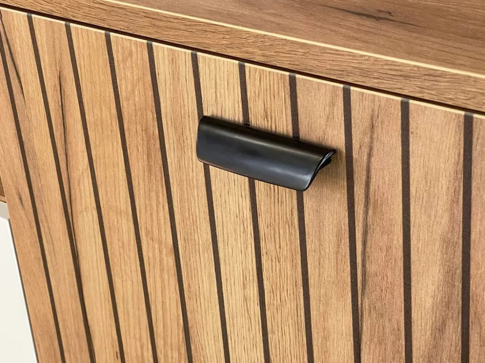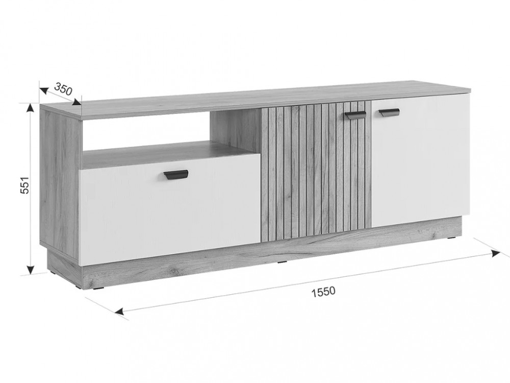 Цвет: дуб крафт золотой/белое дерево Состоит из: тумбы с дверями, выдвижного ящика и открытой секции. Принтерный рисунок на фасаде в виде тонких вертикальных полос- актуальное решение в современном интерьере.