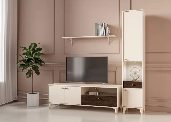 Тумба ТВ "Миндаль" №13.260 включает в себя вместительную секцию за распашными дверцами, выдвижной ящик и открытую нишу.