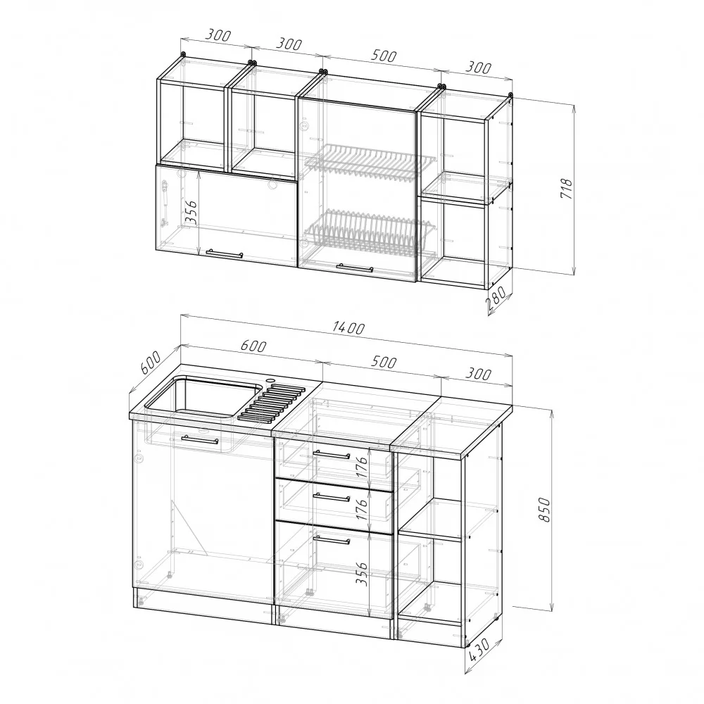 Мойки, смесители и посудосушители в комплекты гарнитуров не входят.