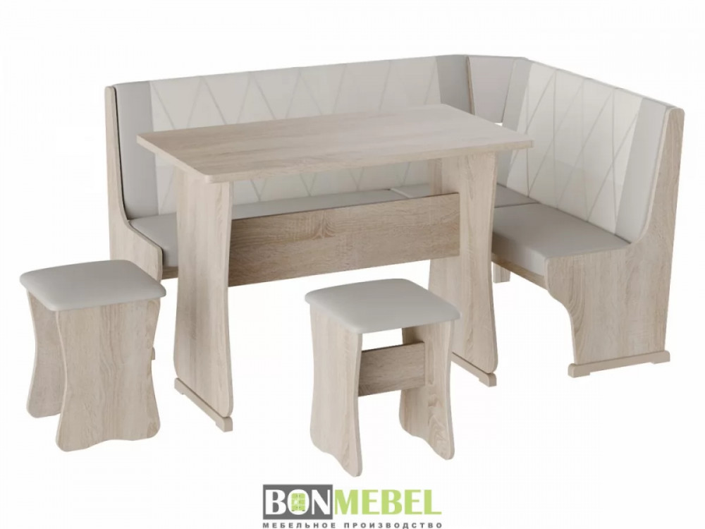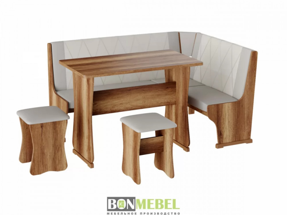 Кухонный уголок Гамма тип 2 со столом и табуретами представлен в нескольких вариантах расцветки, что позволит вам выбрать исполнение, идеально подходящее к интерьеру. Универсальная сборка позволяет выбрать ориентацию угла скамьи при сборке. Обивка из экокожи устойчива к различным загрязнениям и не требует обработки специальными средствами. Вместительность несмотря на компактные габариты набора, композиция идеально подойдет для размещения четырех персон. Для изготовления изделий используется ЛДСП. Обивка скамьи и табуретов произведена из искусственной кожи.
