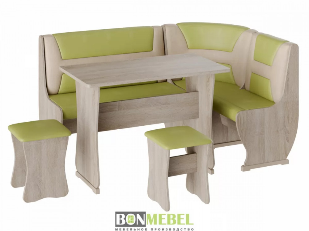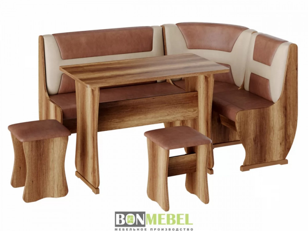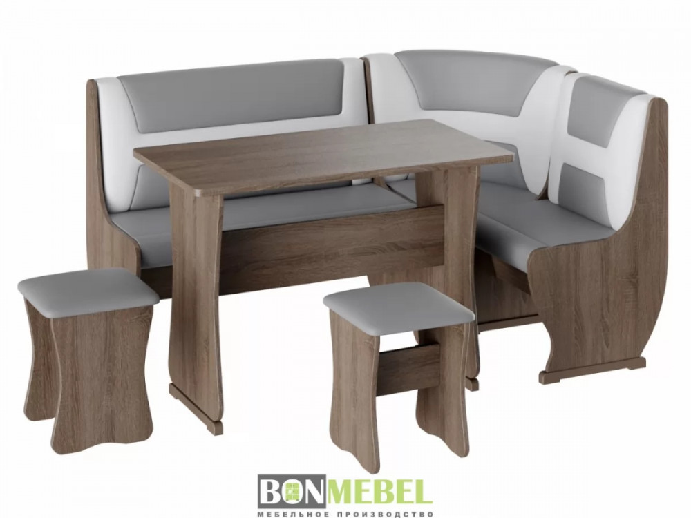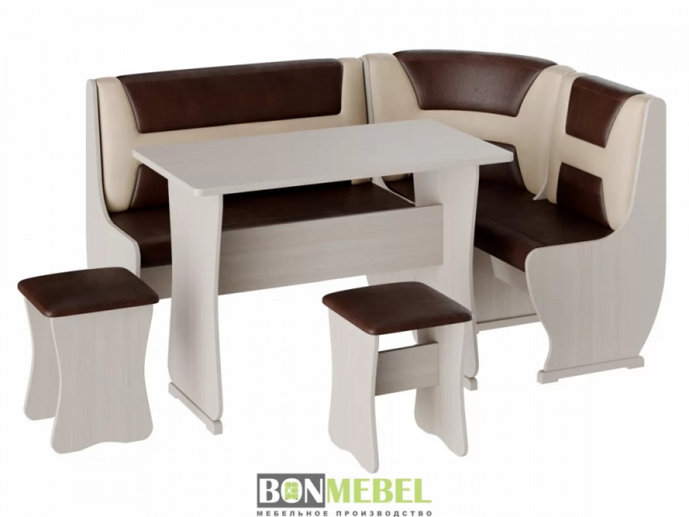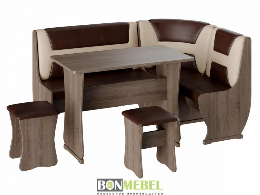 Приятный глазу уголок Уют тип 3 организует даже на небольшой кухне уютное место для приема пищи. В комплекте представлено все необходимое для этого, а именно: угловой диван, две табуретки и обеденный стол. Отличная комплектация позволяет разместить всю семью за столом. Обивка из экокожи легко чистится. Удобное хранение — конструкция дополнена вместительными ящиками. Компактный размер — поместится даже в небольшой кухне.