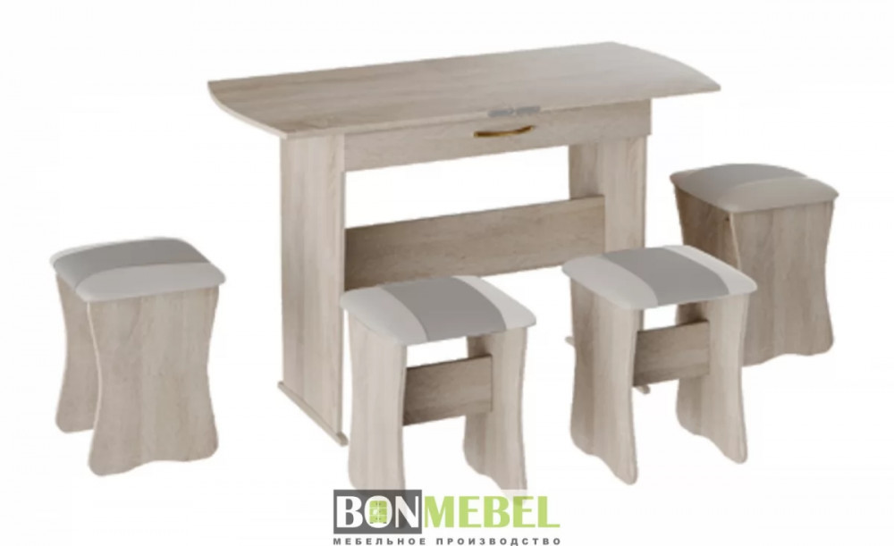 Обеденная группа с табуретами Тип-2 станет практичной и уютной обеденной зоной для вас и ваших гостей. Комплект рассчитан на четыре персоны. Встроенный механизм трансформации позволит увеличить ширину стола почти с 750 мм до 1200 мм. Обивка из экокожи устойчива к различным загрязнениям и не требует обработки специальными средствами. Мягкие сиденья табуретов имеют мягкое и упругое наполнение, что повышает уровень комфортабельности. Различные варианты расцветки помогут подобрать идеальный комплект. Для изготовления изделий используется прочная ЛДСП. Обивка табуретов выполнена из искусственной кожи.