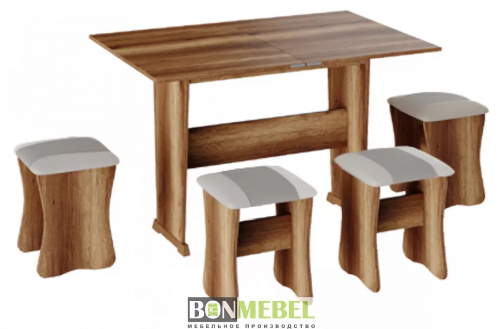 Обеденная группа с табуретами Тип-3 поможет стильно и практично оформить пространство даже на малогабаритной кухне. Комплект рассчитан на четыре персоны. Раскладной стол позволит увеличить ширину стола почти на 40 см за считанные секунды. Обивка из экокожи устойчива к различным загрязнениям и не требует обработки специальными средствами. Мягкие сиденья табуретов имеют мягкое и упругое наполнение, что повышает уровень комфортабельности. Различные варианты расцветки помогут подобрать идеальный комплект. Для изготовления изделий используется прочная ЛДСП. Обивка табуретов выполнена из искусственной кожи.