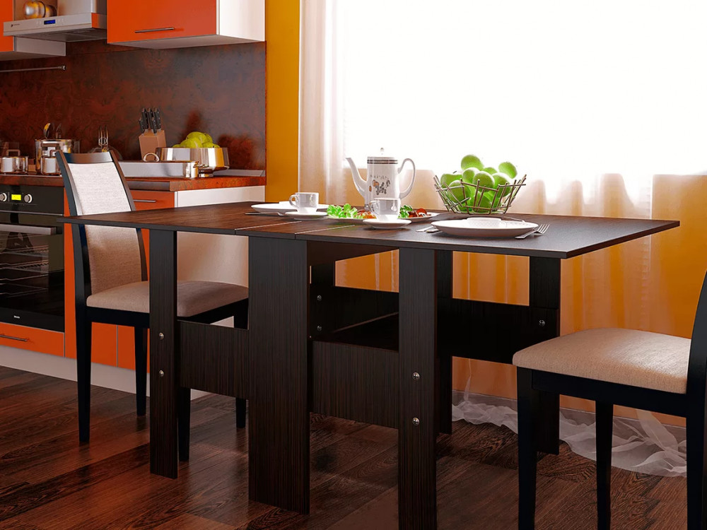 - при необходимости столешница компактной модели раскладывается на две стороны и превращается в полноценный обеденный стол, за которым поместится немало гостей,