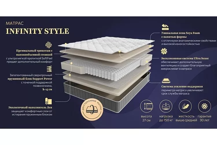 Матрас INFINITY STYLE 1600*2000мм (Пена/лен, жесткий, h 27см)