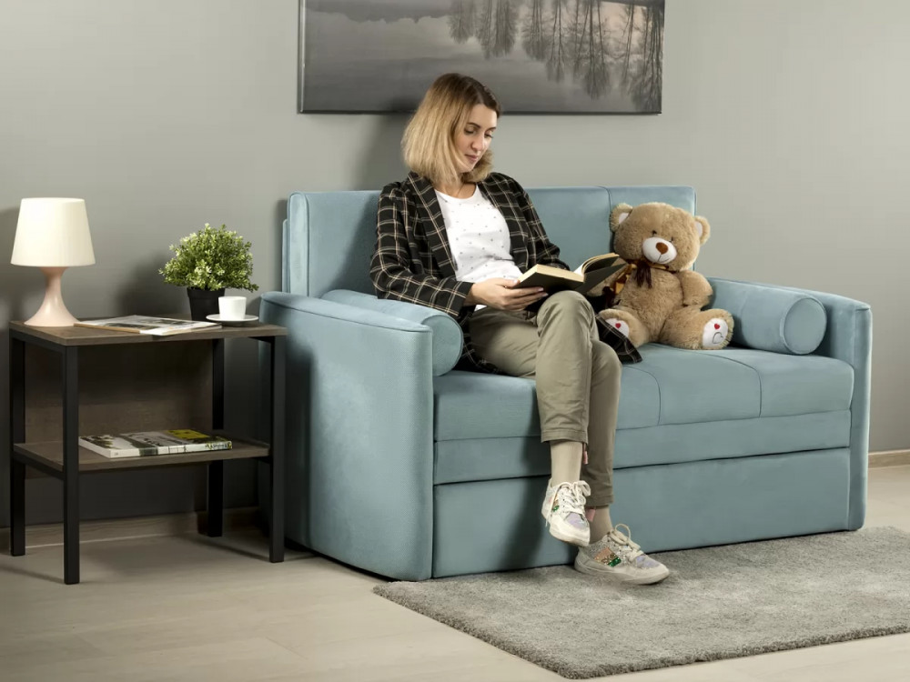 Диван-кровать Мелани Р (120) - компактный современный диванчик. Скругленные подлокотники с кантами подчеркивают эргономичность модели. Простой и надежный механизм трансформации на каждый день обеспечит удобным спальным местом ребенка или подростка. Может использоваться в качестве гостевого спального места для взрослого. Размер сп. места 195 х 120 см, есть небольшой бельевой ящик. Диван выполнен в мягком фактурном велюре. "Пальчиковый эффект" на ткани обивки выражен средне. Опоры - цвет черный, круглые, высота 25 мм., выполнены из высококачественного пластика. Прочность конструкции ножек обеспечена ребрами жесткости и внутренним креплением под фурнитуру.