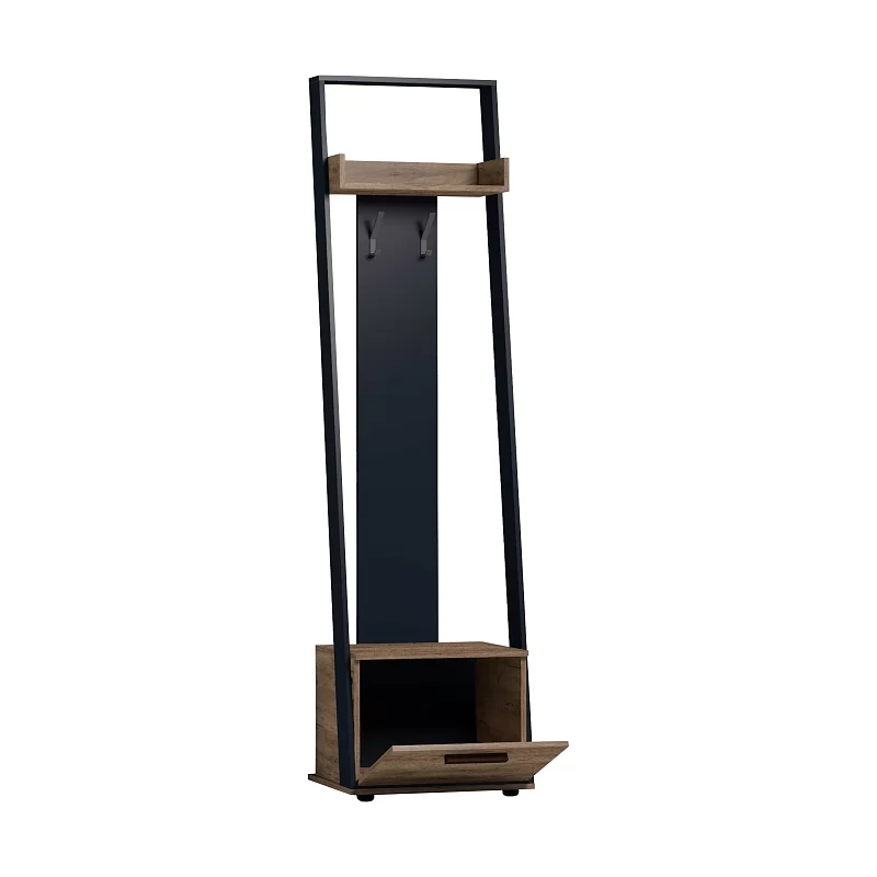 Оригинальная вешалка Nature 77 не займет много места в прихожей, но станет самой яркой деталью вашей входной зоны. Удачная комбинация ЛДСП в декорах Дуб Табачный и Черный является классическим сочетанием современного стиля лофт. Модуль выполняет функции открытой вешалки для верхней одежды и тумбы для обуви. Крепкие металлические крючки способны выдержать нагрузку до 5 кг каждый. Откидной фасад тумбы дополнительно фиксируется при закрывании магнитной защелкой. Регулируемые опоры позволят компенсировать незначительные неровности пола.
