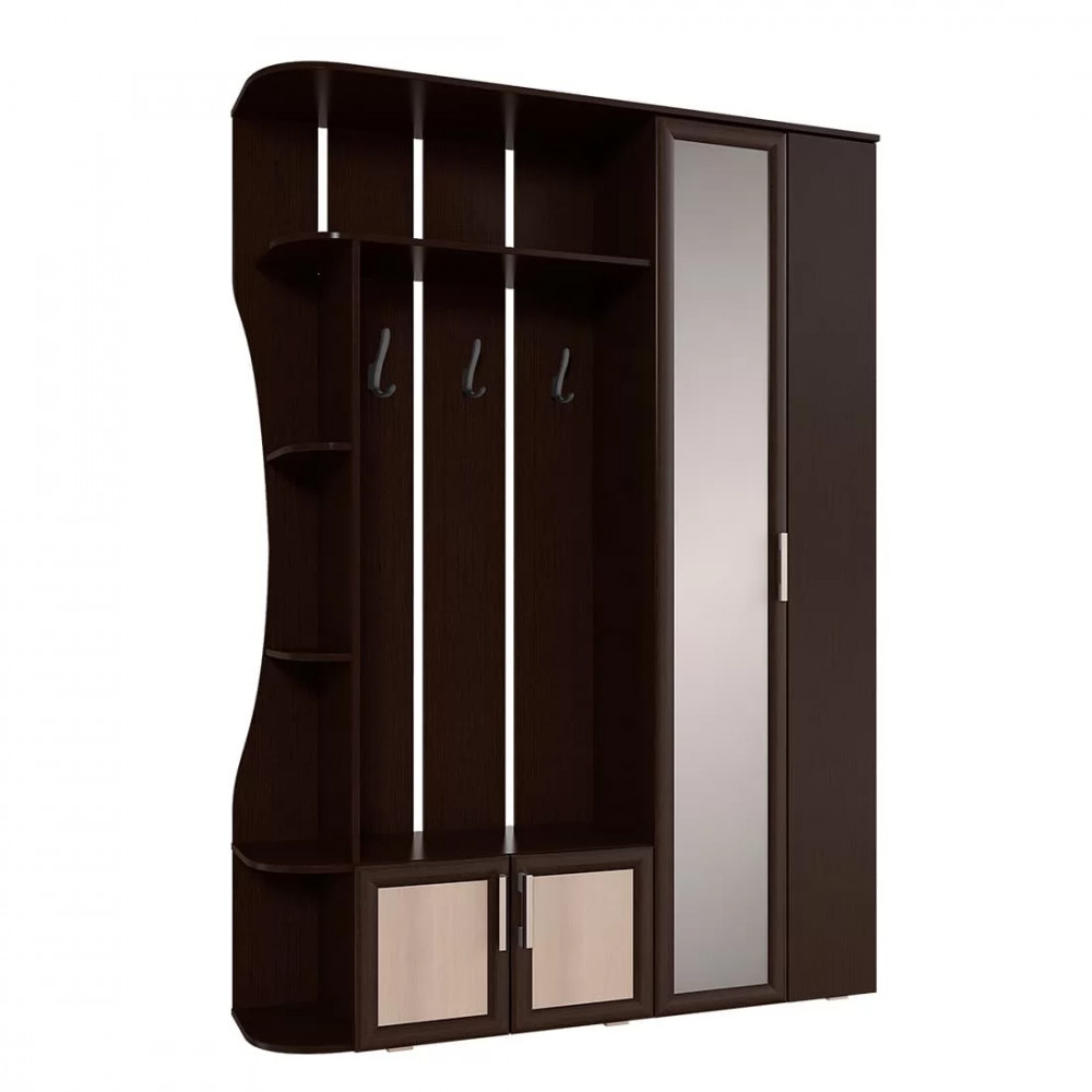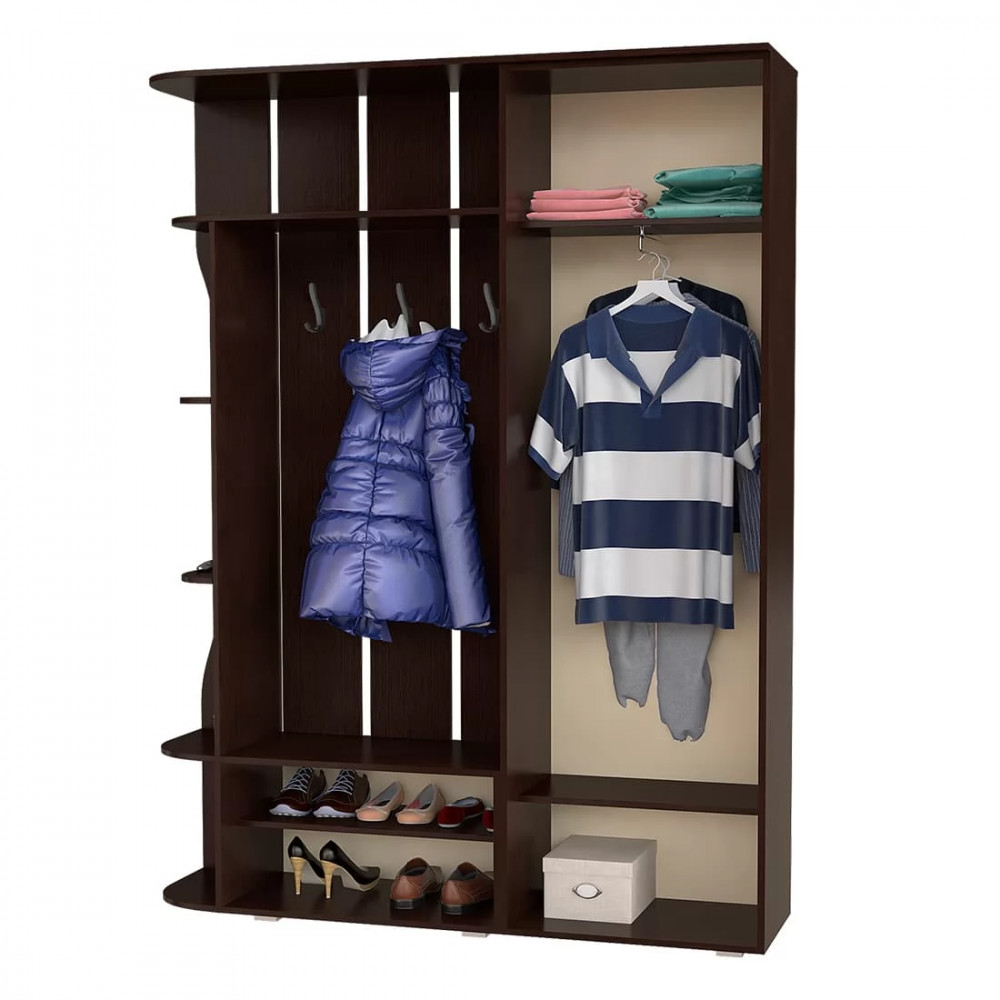 - модель состоит из распашного шкафа, открытой зоны с крючками для одежды и полками для аксессуаров, а также отделения для обуви,
