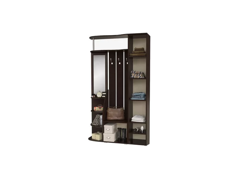- модель состоит из распашного шкафа, открытой зоны с крючками для одежды и полками для аксессуаров, а также отделения для обуви,