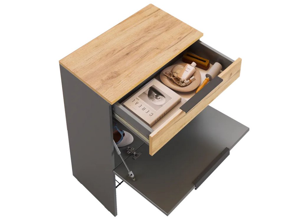 Большая секция для хранения открывается с помощью газлифта, что обеспечивает удобный доступ к содержимому и легкость в использовании. Сетчатая полка для обуви позволяет аккуратно разместить обувь, обеспечивая вентиляцию и удобство.