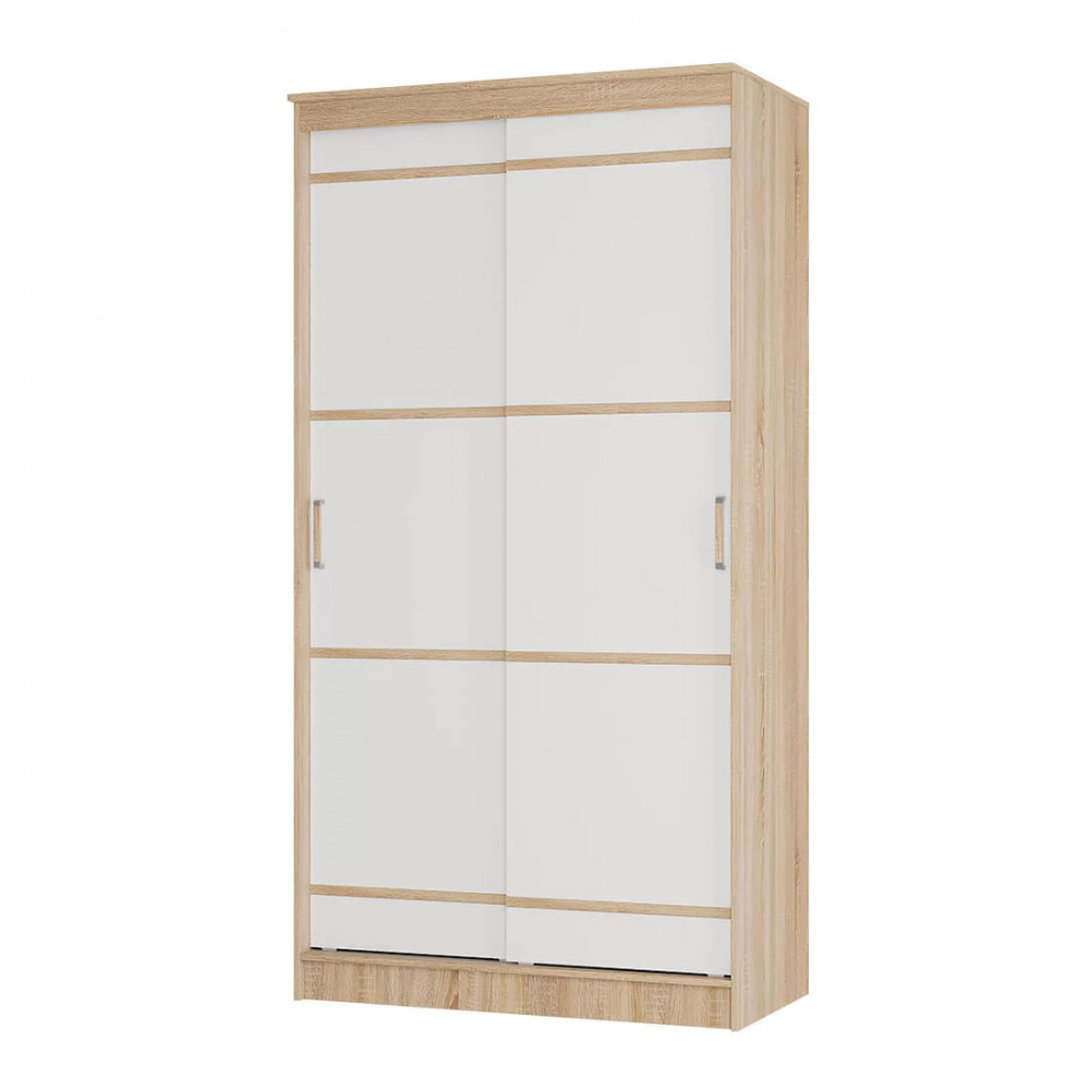 Он сделан из ЛДСП высокого качества в комбинации цветов сонома и белый, раздвижные дверцы декорированы темными полосами и дополнены удобными ручками. Внутри модель содержит все необходимые зоны для хранения одежды и обуви: отделение для плечиков, а также полки и ниши для остальных вещей.