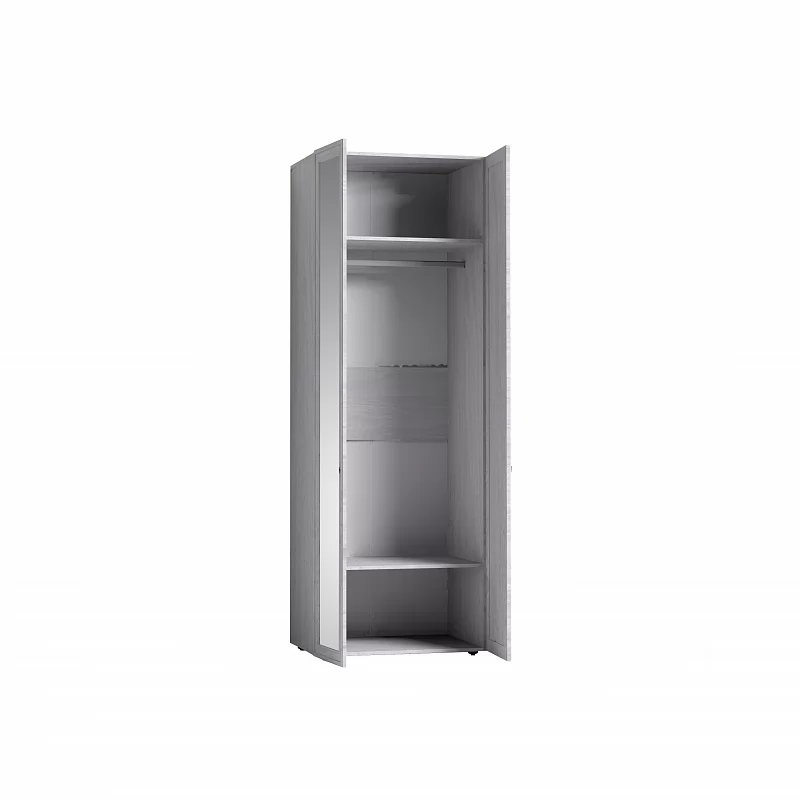 PAOLA 54 Шкаф для одежды разделен на КОРПУС и 2 ФАСАДА. Обратите внимание: в Фасад входит только одна створка. Поэтому при заказе изделия нужно указывать два модуля Фасад. Заказывайте на выбор глухую или зеркальную дверцу и моделируйте внешний вид шкафа на свой вкус. Оба фасада декорированы маленькими металлическими ручками и обрамлены профилем МДФ. Распашной шкаф для одежды оснащен двумя полками и стационарной штангой 757 мм, которая позволит разместить в шкафу не менее 10 плечиков с верхней одеждой. Зеркало проклеено с оборотной стороны специальной защитной пленкой, которая не позволит осколкам упасть в том случае, если зеркало разобьется. Для надежности шкаф обязательно крепится к стене на подвесы. Регулируемые опоры позволят компенсировать незначительные неровности пола.