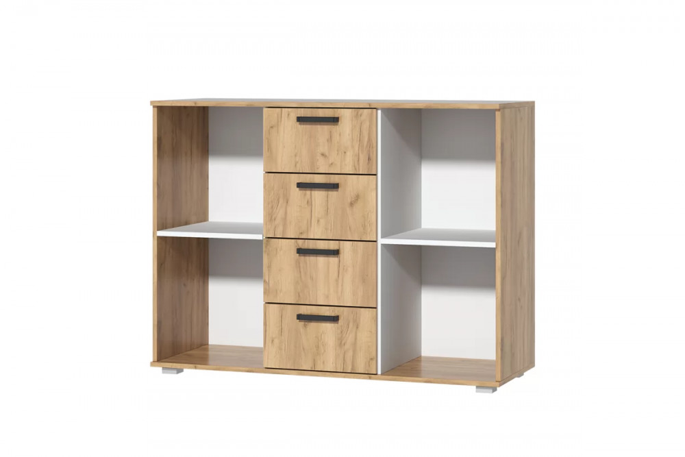 Особенности комода:Комод имеет 4 ящика и 2 отдела с полкой.Ящики на роликовых направляющих 400 мм.Оригинальные черные пластиковые ручки (128 мм).Современное сочетание цветов в изделии.Материал корпуса:      ЛДСПМатериал фасада:      ЛДСП   Кромка:      ПВХ 0,4 ммОпора:      ОСК-20КТип петли:      накладнаяМатериал ручек: пластикРучки:      С 18 128 мм в черном цветеНаправляющие:      роликовыеГлубина ящиков:      400 ммВес, кг:   54Объем, м3     0,1Количество упаковок:      2 Ориентация сборки:      левая/правая
