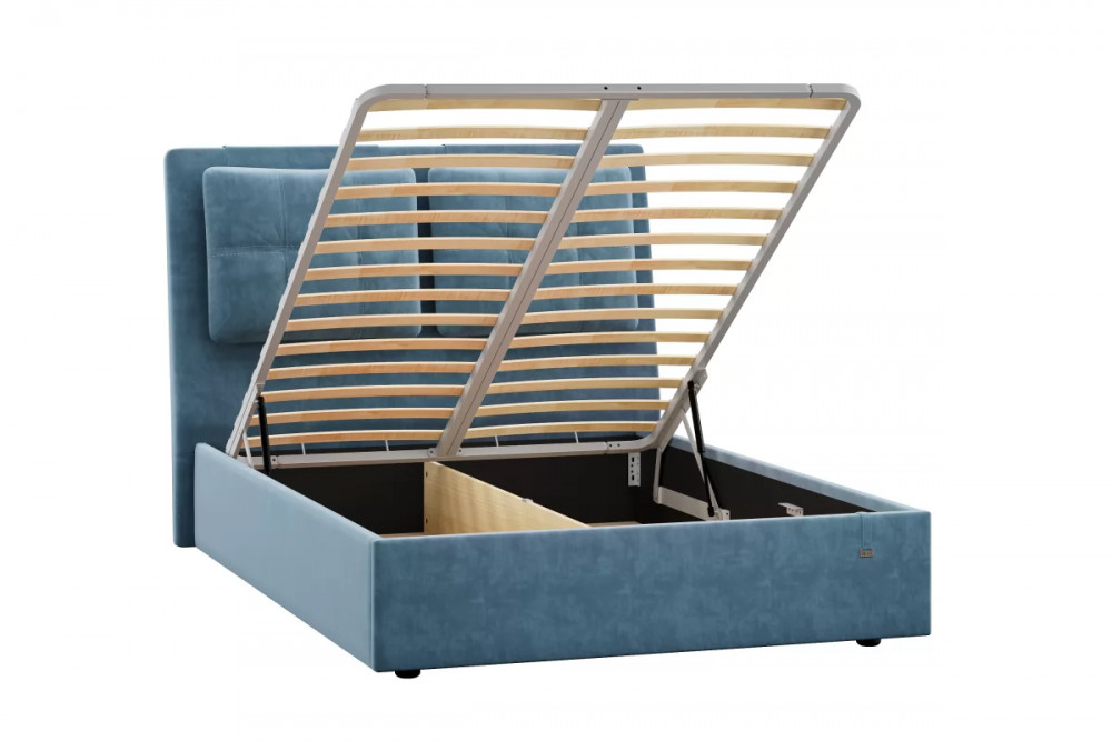 Подъемный механизм легок в управлении, а вместительный короб внутри кровати подойдет для хранения подушек, белья и других вещей.