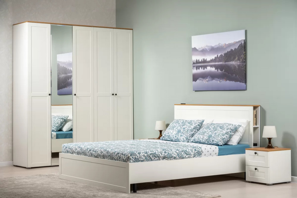 В изголовье кровати предусмотрены вместительные ниши. Шкафная группа полноценной глубины