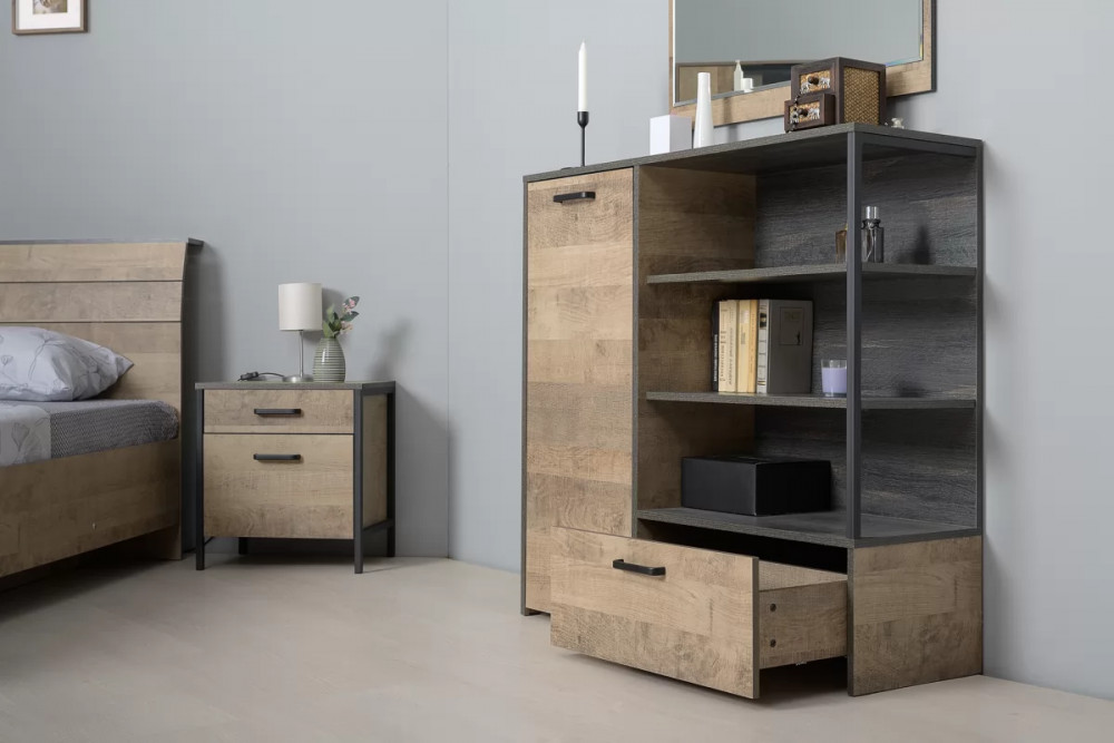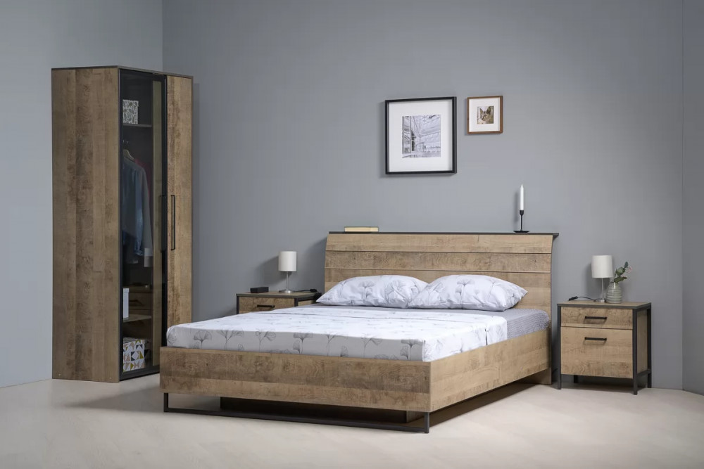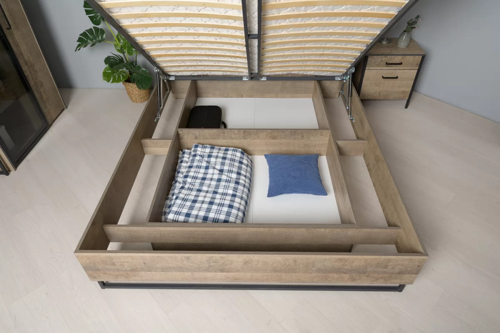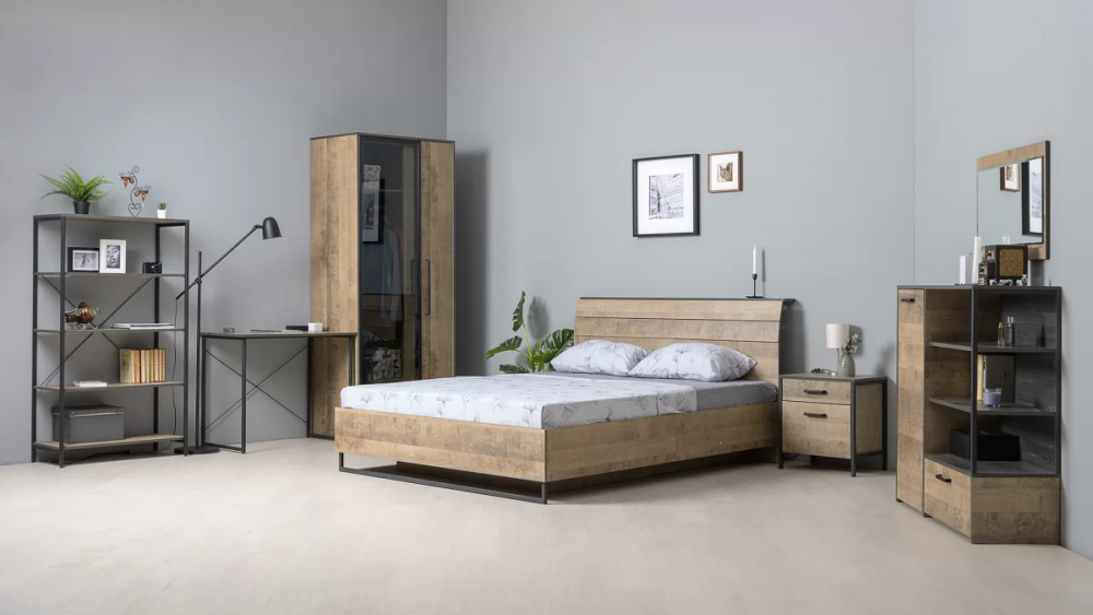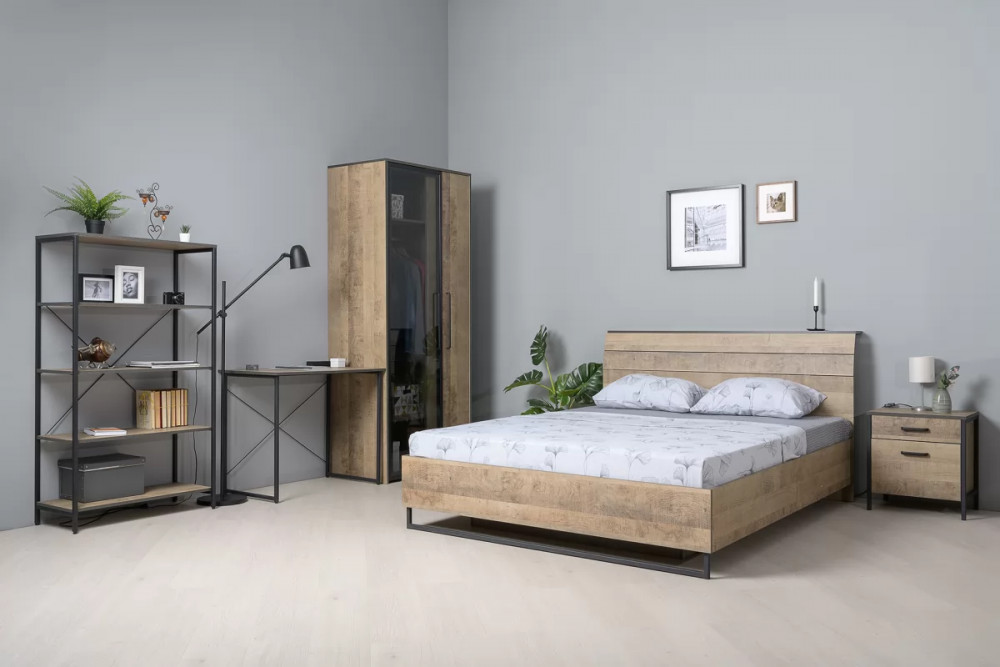 Брутальная спальня в стиле лофт. Кровать оснащена ортопедическим основанием с подъёмным механизмом, который открывает доступ к вместительному коробу для хранения. Металлические опоры делают эту мебель надёжной, аутентичной и функциональной. Лицевая фурнитура с тем же покрытием придаёт мебели индустриальную эстетику. Шкаф со створкой из тонированного стекла является современным и оригинальным решением.
